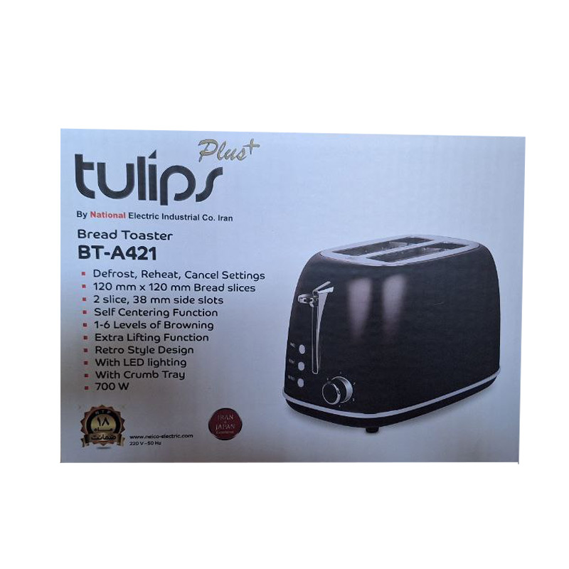 توستر نان تولیپس مدل BT -A421 متناسب با سلایق مختلف به گونه ای طراحی شده که قابلیت برشته کردن نان را به صورت یکنواخت دارد و همچنین اگر نان های خریداری شده را داخل فیریزر نگهداری می کنید با دارا بودن دکمه دیفراست ( یخ زدایی ) درکمترین زمان به صورت یکنواخت نان را یخ زدایی می کند. از ویژگی های دیگر این مدل داشتن دکمه قطع اضطراری است که در هنگام نیاز می توانید از آن استفاده کنید. دارای سینی جمع آوری خرده نان است و همچنین از لحاظ شکل ظاهری دارای بدنه فلزی و رنگ مشکی است.